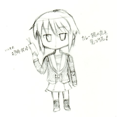 今回はサンクリ10周年記念と言うことでブロックノートを描きました。と私が絵を描いてるとにーさんが「なんかキミの描く長門さんてやわらか○車みたいだよね」と言う発言から新たなキャラクターが生み出されてしました。これは冬向けのマンガで描いていこうかなと思ってます。でも、その発想は気づかなかった…。